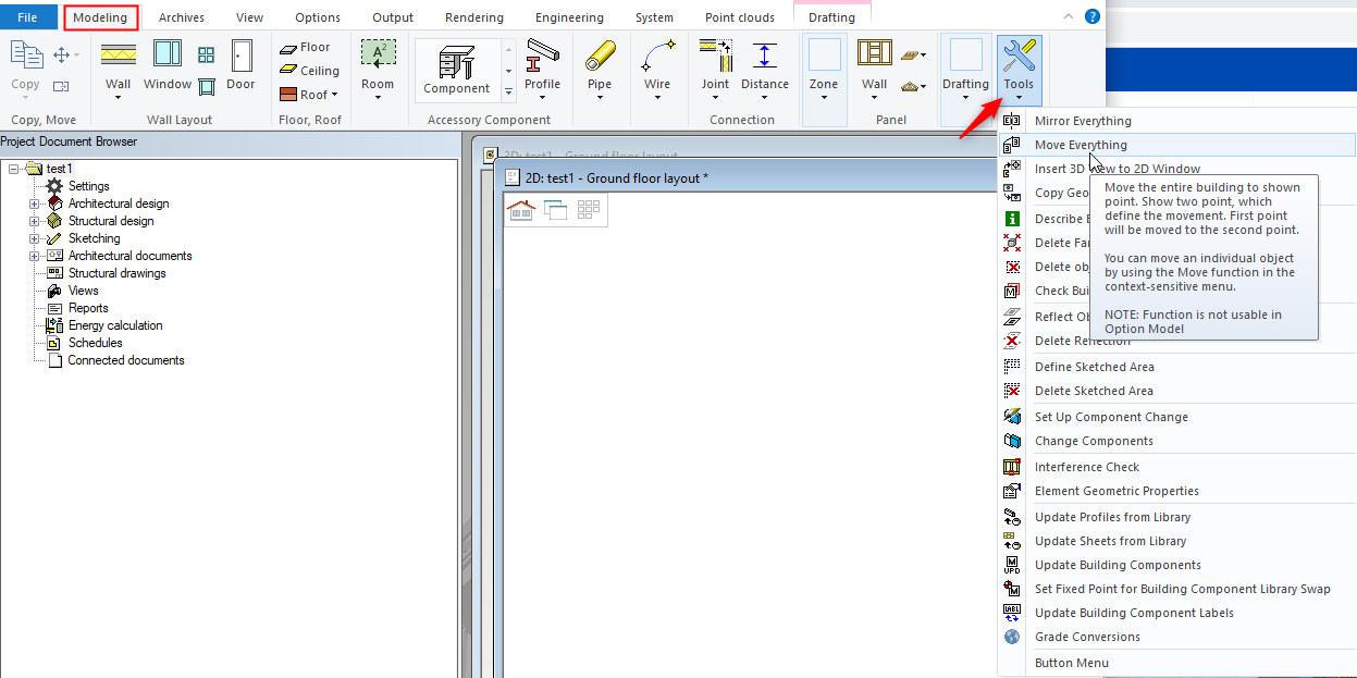 2. In 'Modelling' tab click on 'Tools' icon and form the drop-down menu click 'Move Everything'