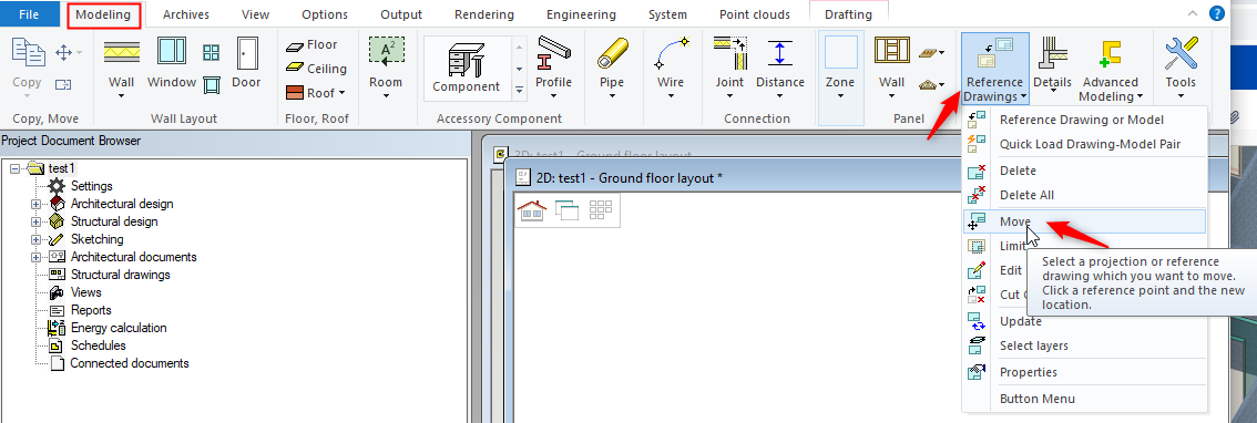 2. In 'Modelling' tab click on 'Reference Drawings' icon and form the drop-down menu click 'Move'