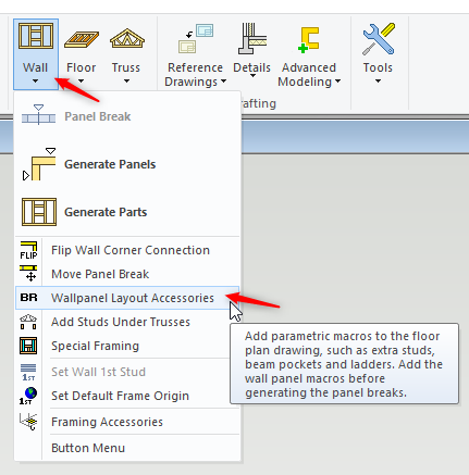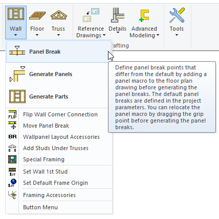 - The default panel breaks are defined in the project parameters ( Min and Max Wall panel length ). Before we generate wall panel, first we will manually add 'Panel Break' ( panel macro ) to the ground floor plan.