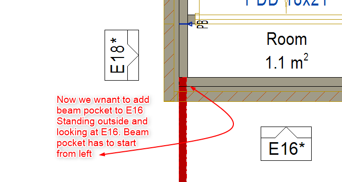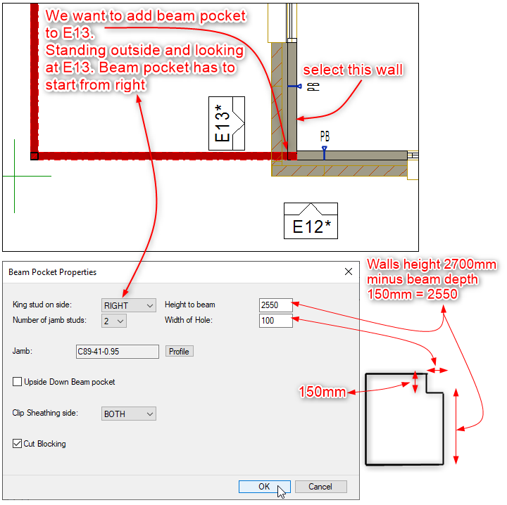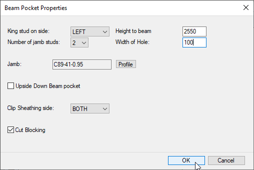 In the corner situation you only want a King Stud on one side. The orientation of the wall panel is taken as reference and looking from the outside, therefore we will pick the right side for the stud. Height of the beam means, at what height beam must sit. The width of the hole is to suit the size of the beam.