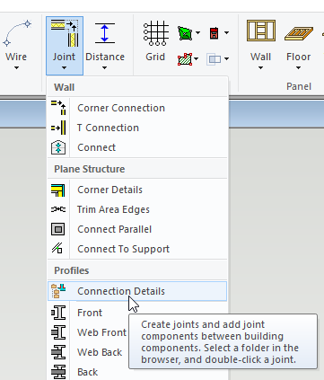 • In 'Modelling' tab click on the ‘Joint ‘icon and from the drop-down menu  select ‘Connection Details’.