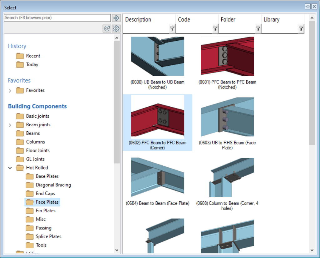 • Go to  ‘Hot Rolled’ → ‘Face Plate’ folder. Click on the ‘(0602) PFC Beam to PFC Beam (Corner)