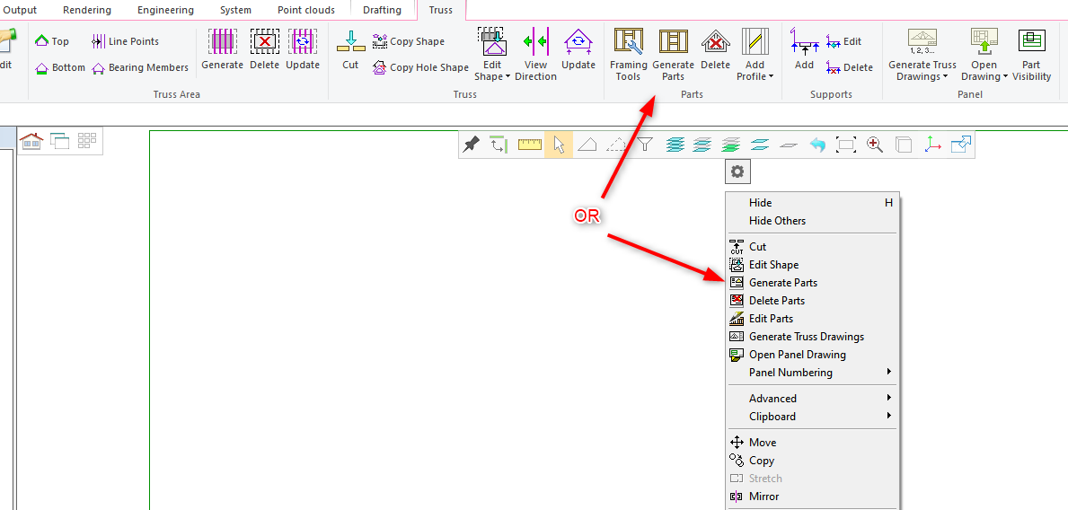 - First we will generate parts for common trusses. Select all the simple roof trusses ( hold down CTRL key to select more than one truss ). Now Truss tab gets activated in the ribbon bar. Click ‘Generate Parts’ OR After selecting the trusses, right click and from the contextual menu click on 'Generate Parts'.