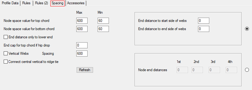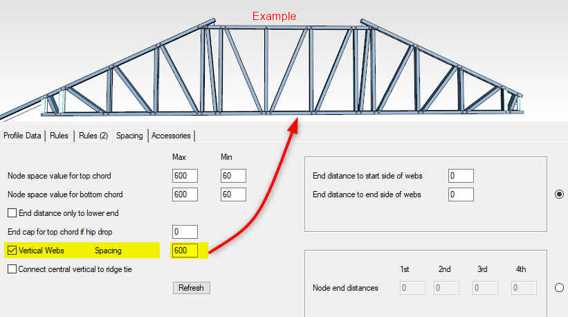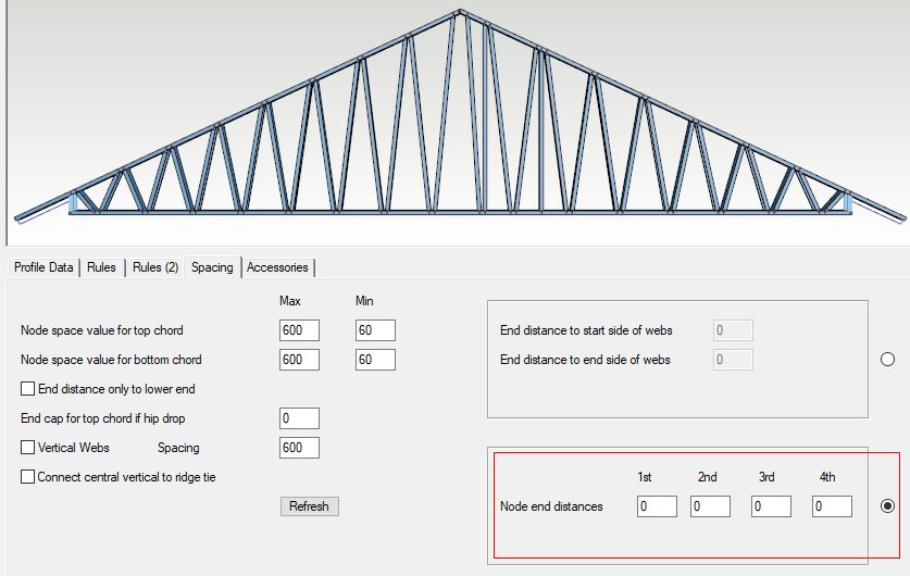 - Set the location of the first diagonals accurately : For the first four member node points exact distances can be changed by entering 'Node end distances fields. You can set one or all four node distances to suit. Remember that it's possible to save different default settings in the truss library.