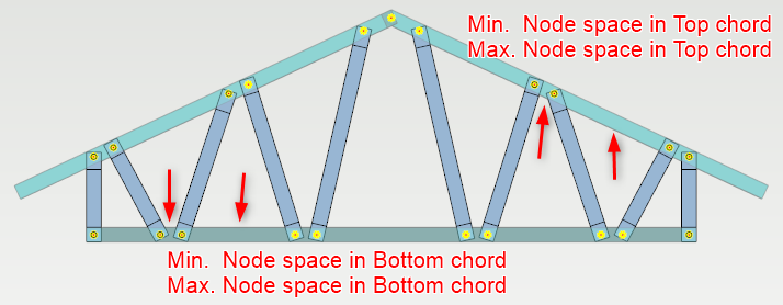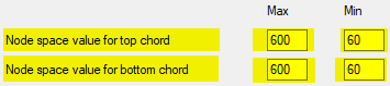 - Node space value for top or bottom chord : Set maximum and minimum value for node spaces in top and bottom chord. You can define with minimum value how close webs can be and with maximum value you can control how many webs are added.