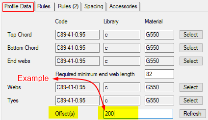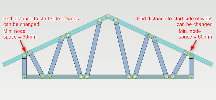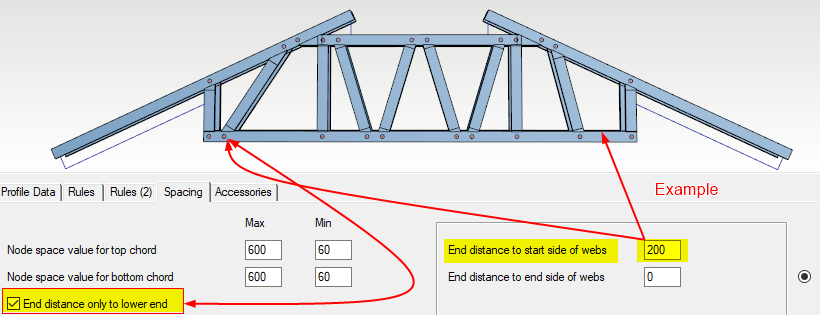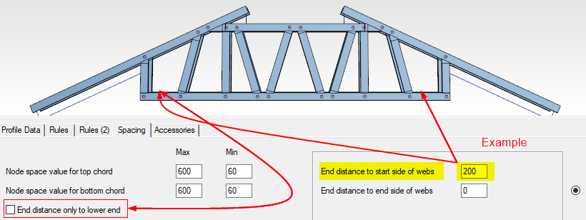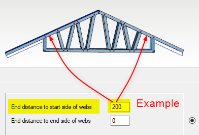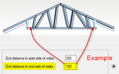 - End distance to start side of webs : Distance from truss edge to start side of first web ( both ends if symmetric truss OR non-symmetric truss and End distance only lower end is not checked. )