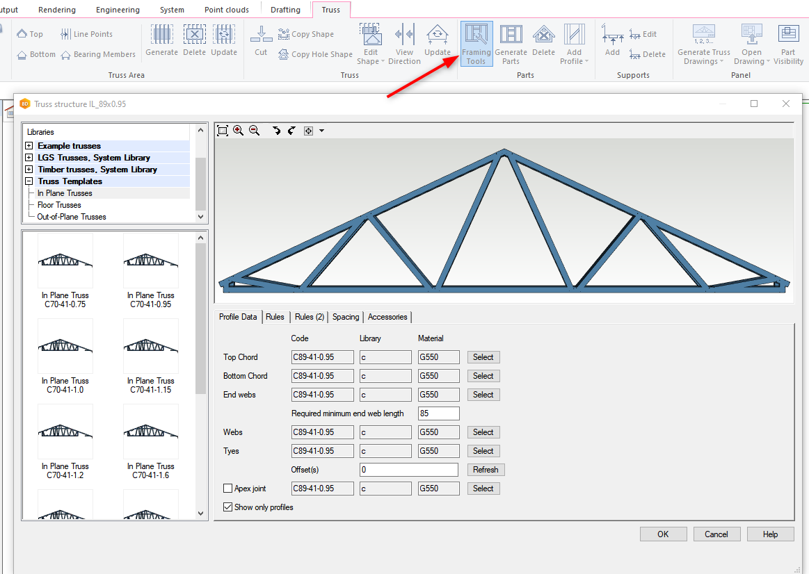 4. The framing tools are set for each truss when the trusses are first drawn in, but you can edit them via the Framing Tools button on the ribbon bar.