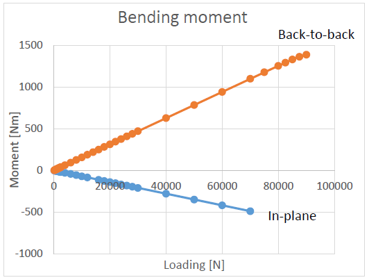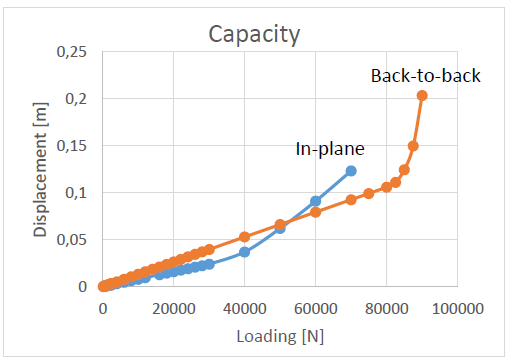 In the capacity chart, the displacement of the in-plane and back-to-back webs is displayed in respect of the loading. In the beginning of the test displacement of both webs is increasing linearly. The maximum capacity of the web can be considered to the point where displacement diverges from the linear behavior. According to the ANSYS tests the back-to-back web has greater capacity although the bending moment stress is also greater. That is explained by the direction of the bending.