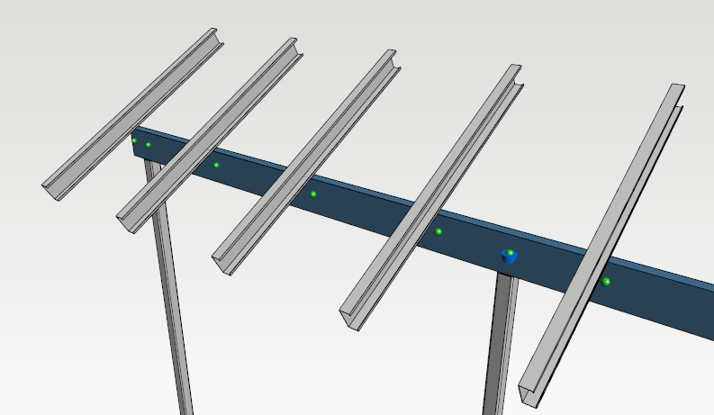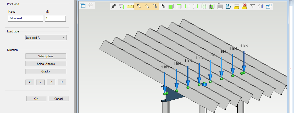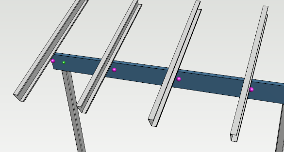 In this example rafters will have some load for the beam and the beam is supported over the posts, nodes are inserted for each rafter and post.