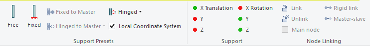 Select the first column node and select support conditions in the ribbon menu. Support conditions are defined in six degrees of the freedom, three for translations and three for rotation. Some typical situations are stored in Support Presets.