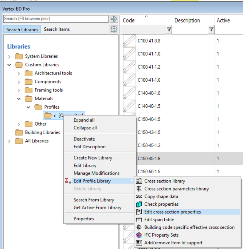 In the browser, right-click on the library you are editing again and select Edit Profile Library > Cross section library.