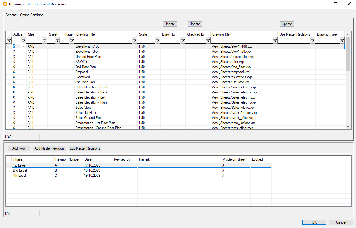 The document schedule tool has been renewed. Now you can easily manage all document information, including revisions, on one screen. Revisions can be easily switched from revision per sheet to project wide revision and multiple revsions can be easily copied to multiple sheets in a single click