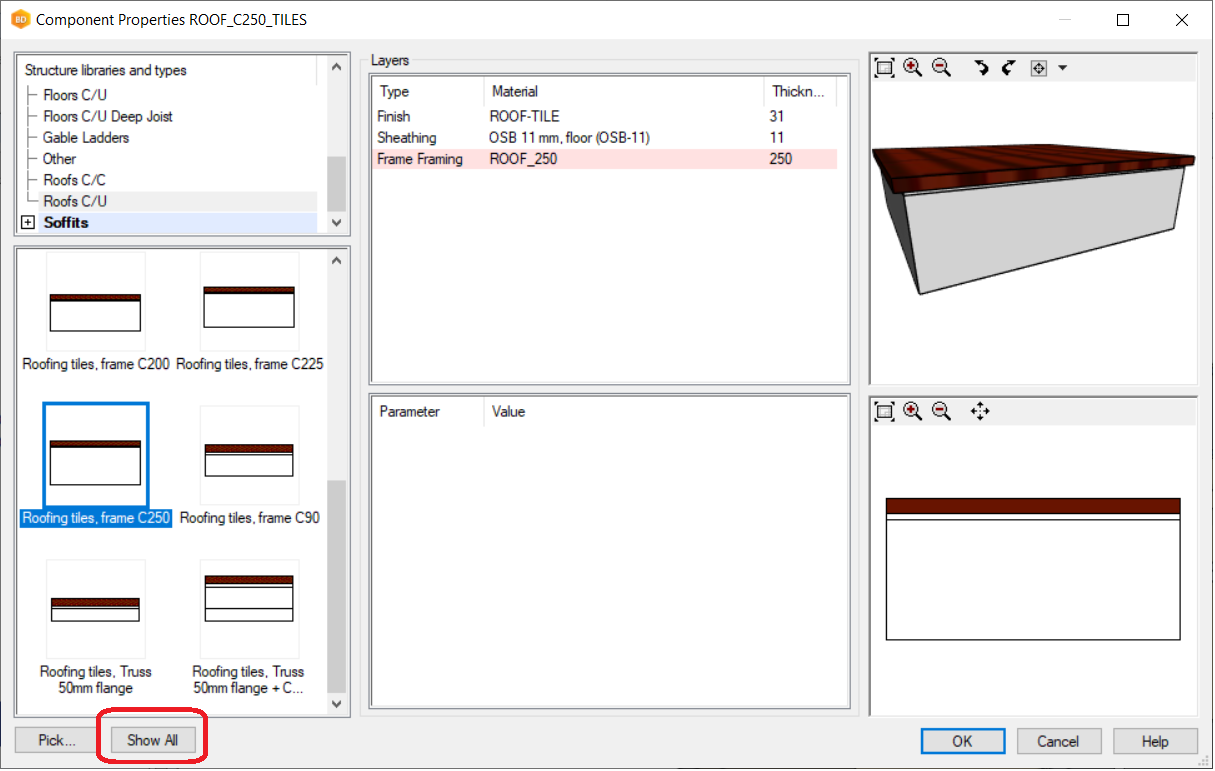 Repeat steps 3 to 6 for the roof. However, slabs and roofs do not have a specific tool Change IFC Slab/Roof to Vertex Slab/Roof. When the roof has been converted and appears in the model tree as “Floor---------------”, pick these floors and select Properties to pick a roof from the library. Roof selections are not visible until Show All is clicked.