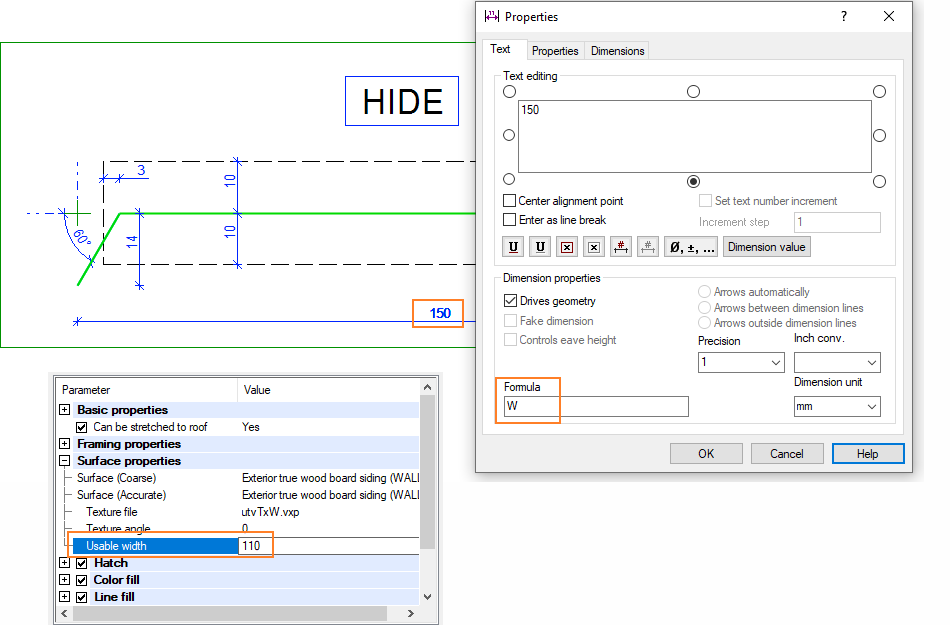 It is possible to control the width of the cladding board from the wall layer parameters. When the dimension constraint has the variable W set in the Formula field, the value of the Usable width in the layer parameters is loaded as the value of the dimension constraint. This enables claddings of varying widths by using just one texture file. Solving the constraints requires that 2D Constraint Manager is enabled.