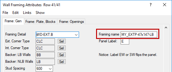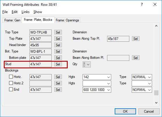 Edit the other parameters on the new row. For example, select the tab Frame: Plates, Blocks, and select the Stud cross section by clicking the Sel button.