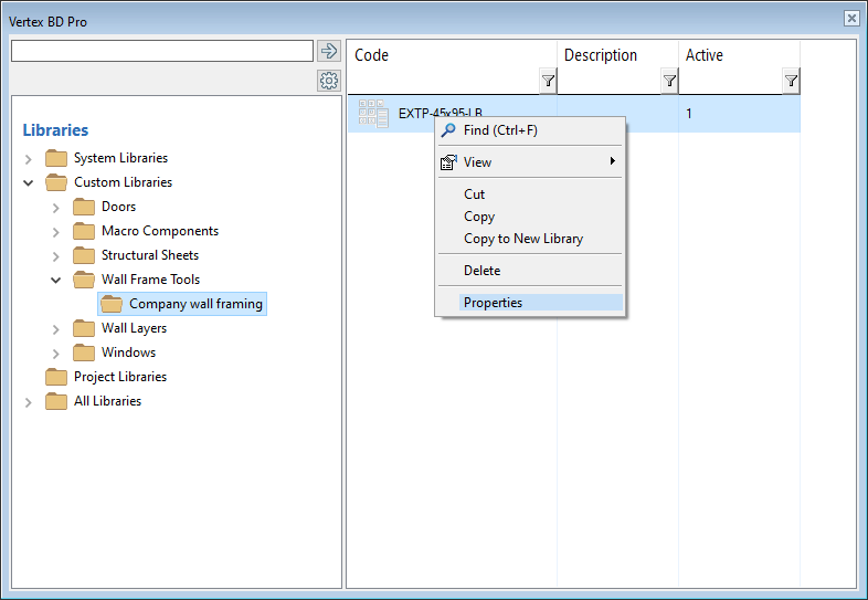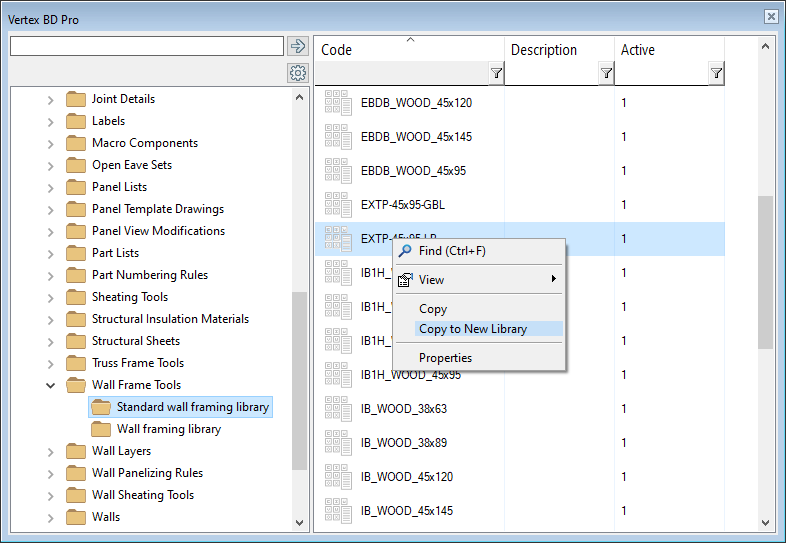 - If you want to copy the tools to an existing custom library, select Copy. Then select a library in the Custom Libraries / Wall Frame Tools folder, open the right-click menu and select Paste.