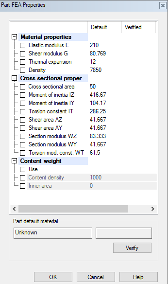 All values of Part FEA properties can be updated by typing new values in the Verified field.