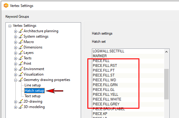 Note: The Vertex system color fills are found in the hatch setup in the system settings. Select File > Preferences > Edit. Open the branch Vertex Settings > Geometry drawing properties, and select Hatch setup.