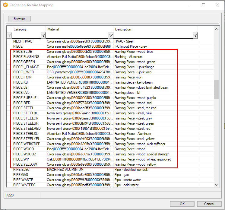 In the Rendering Texture Mapping window, scroll to PIECE.* categories.