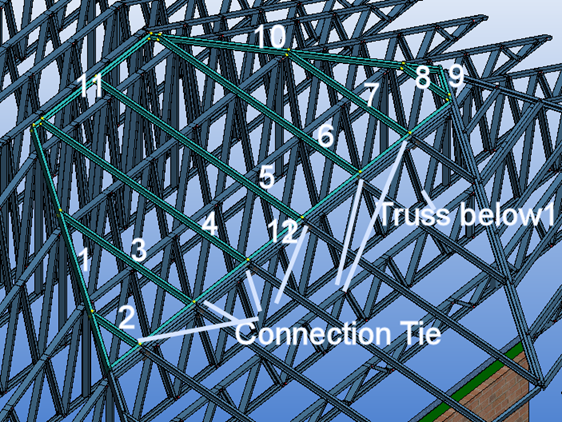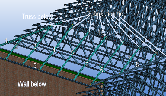 Make sure that members 1, 3 - 7 touch trusses below. Set function property of members like in table below. Rake members 9, 11 and 12 are ignored in engineering. Connect lower end of rafters 2-7 to top cord of truss below 1 with connection tie. Connect rafter 8 lower end with connection tie to valley rafter of the other roof panel.