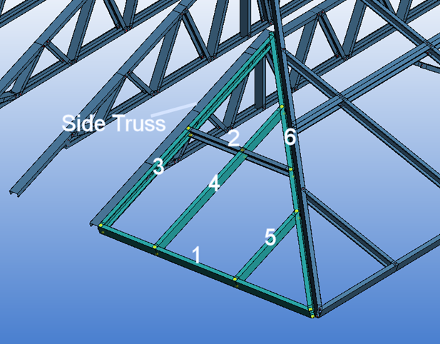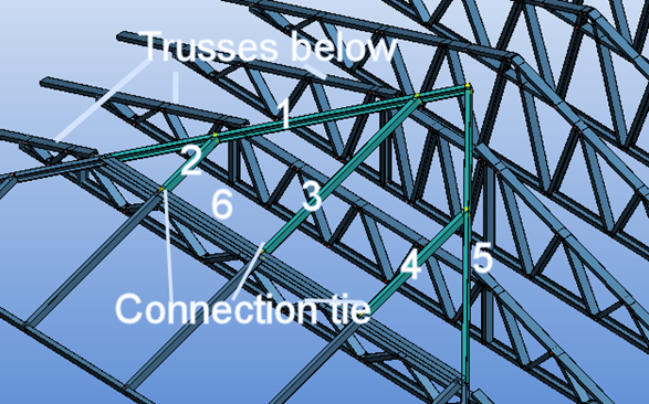 Make sure that members 1, 3-5 touch trusses below. Set function property of members like in table below. Rake member 6 is ignored in engineering. Connect lower end of rafters 2-4, hip rafter 1 and 5 to top cord of truss below with connection tie.