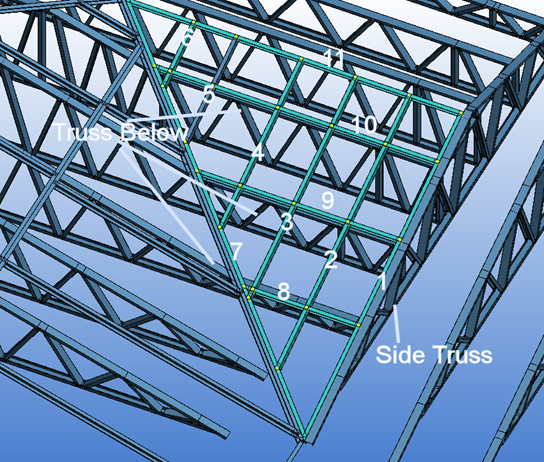 The idea to pass engineering of trusses with roof panels above is to define panel members and connections so that each member has at least two bearings or member function property is set so that member is ignored in engineering. Bearing span direction of panel is selected based on surrounding trusses and other bearing objects. Member function property can be used to define load path, support relations and to ignore some panel members in engineering.