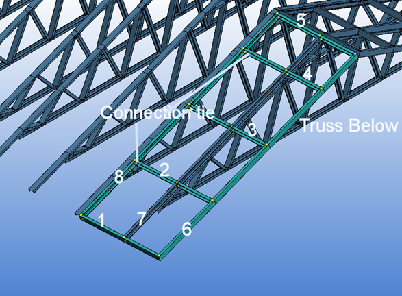 Make sure that members 2-5 touch truss below. Set function property of members like in table below. Rake members 1, 6-8 are ignored in engineering. Use connection tie to connect rafters 2-5 ends to side truss top chord.