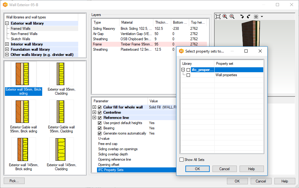Default IFC property sets for a wall