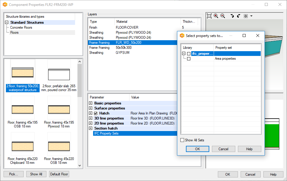 Unlike for walls, IFC property sets are defined as layer-specific for horizontal structures.You can select IFC property sets for the layers of a floor, ceiling or roof, when you are adding the structure. Select a structure, select a layer, and move the cursor to the parameter list box. Right-click to open the context-sensitive menu, and select Show All Parameters. Select IFC Property Sets.The "Select Property Sets to Use" dialog box opens. Select the property sets in the dialog box and click OK.