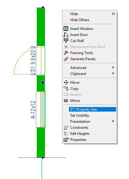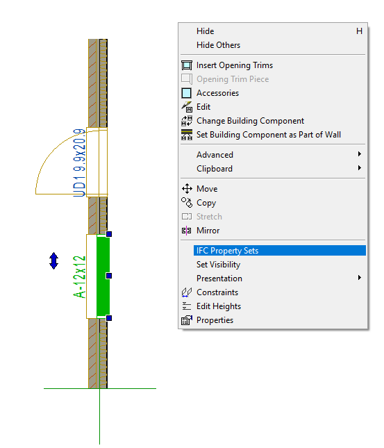 You can select IFC property sets for a window or door component once you have added the component. Select a window/door component, and right-click to open the context-sensitive menu. Select the function IFC Property Sets, select the property sets in the dialog box, and click OK.