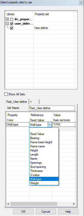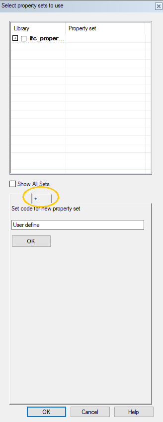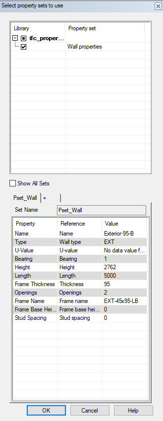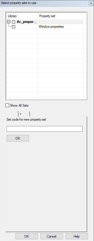 Only the property sets that are suitable for the object type in question are shown in the dialog box by default. You can view all property sets by selecting Show All Sets in the dialog box.