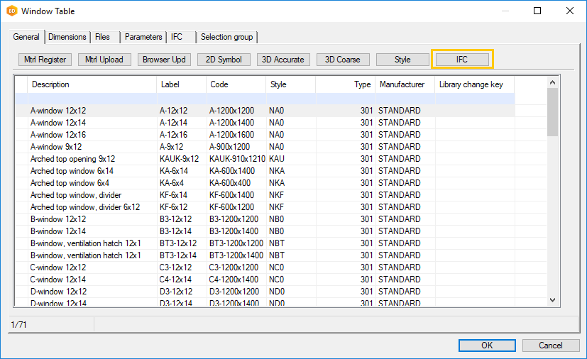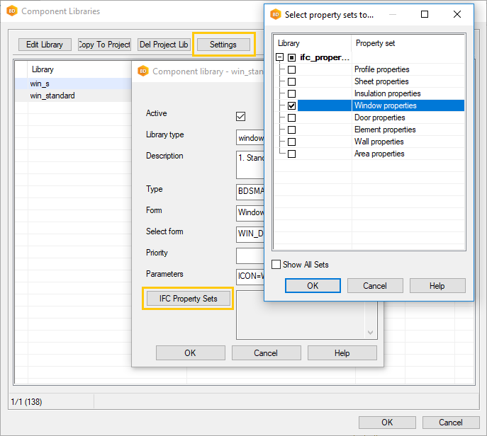 Select a library, for example win_standard, and click Settings. Click IFC Property Sets, and select the property sets for the library. Exit the library editing mode by selecting OK.