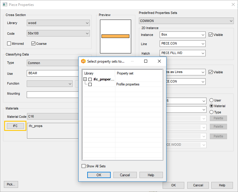 Select a library, for example wood, and select IFC Property Sets. The "Select Property Sets to Use" dialog box opens. Select the property sets in the dialog box and click OK. Exit the library editing mode by selecting OK.