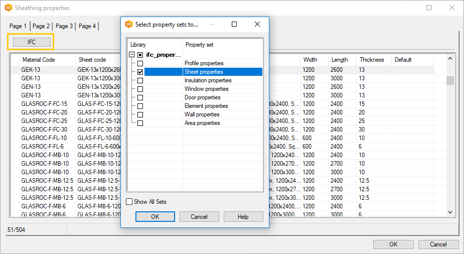 Open the sheathing library for editing, select a sheet and click IFC. The "Select Property Sets to Use" dialog box opens. Select the property sets in the dialog box and click OK.