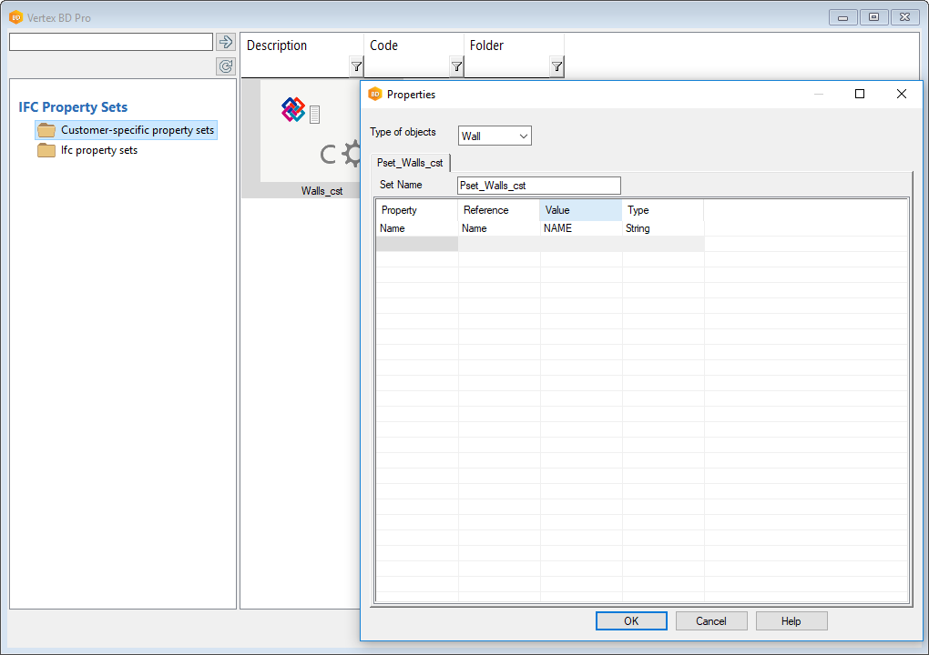Vertex property sets included in the standard environment of the software have the title ifc_property_sets in the dialog box. If there are customer-specific Vertex property sets in the software environment, they have the title ifc_property_set_cst.