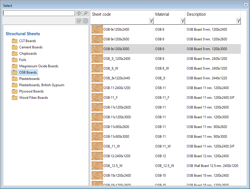 The sheathing selection from the library has been renewed. The browser is now used instead of the selection list. The interface brings up a view where all libraries are visible. As a user in the browser, you can easily filter the view to show only, for example, sheathing boards of a certain size. The new version brings ease of use, a better overall view of sheathing libraries and is simple, easy and fast to use. It is also consistent with commonly used browser selection.