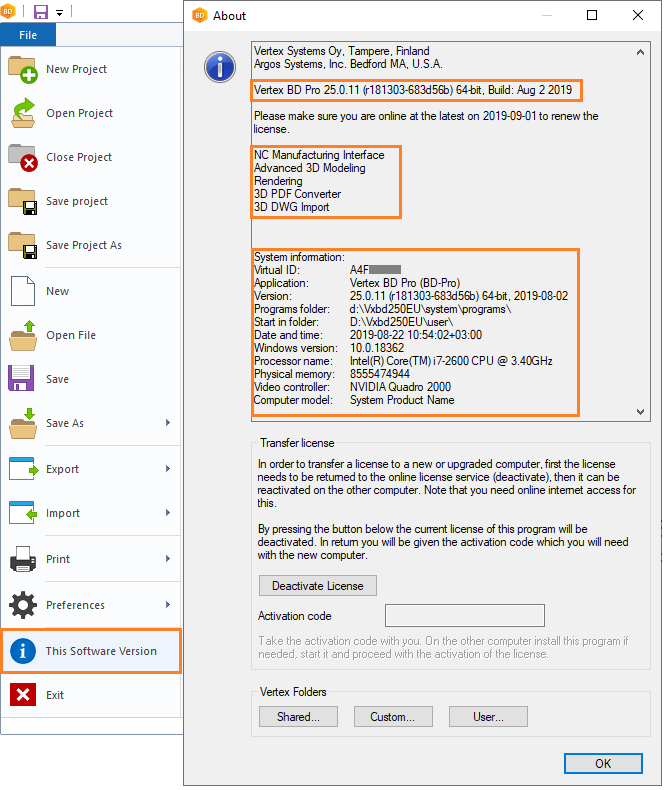 - License add-on options: NC Manufacturing Interface, Advanced 3D Modeling, Rendering, 3D PDF Converter, 3D DWG Import.