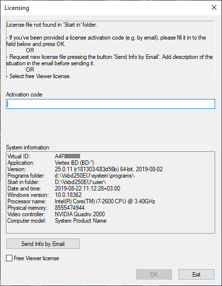 Next is a sample screenshot of the message that the program gives at startup. The message is caused by a missing NetVid license activation code. The program starts when the user enters the activation code in the Activation code field.