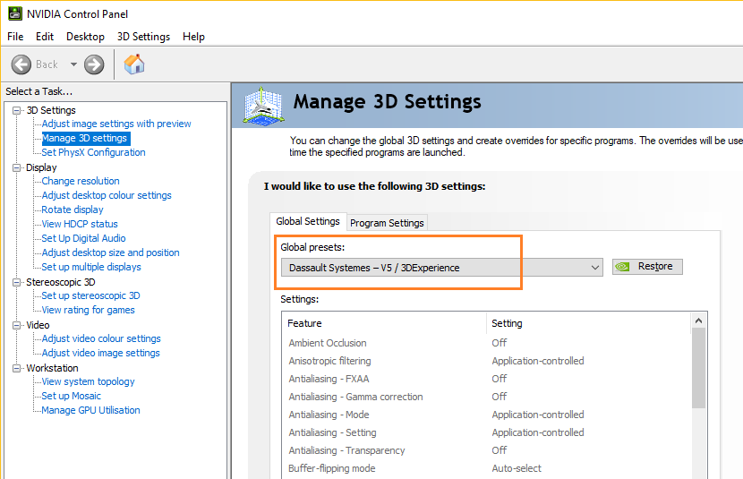 - In addition, check the graphics card driver setting by selecting 3D Settings -> Manage 3D Settings -> Global Settings - Global presets in the Nvidia control panel. Select any of the Dassault* options, version does not matter, for example: