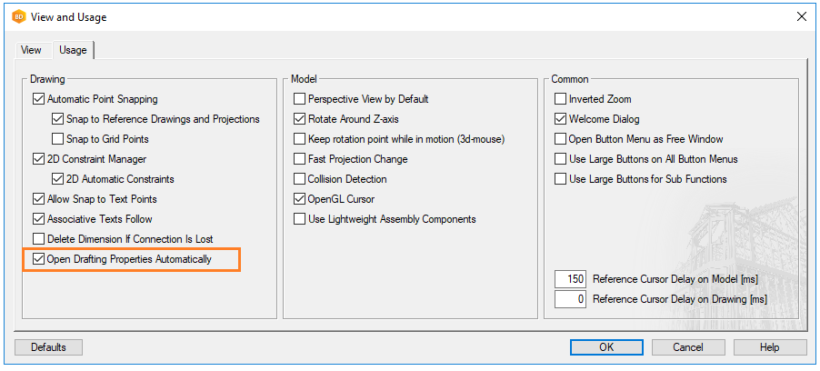 Open drafting properties automatically when adding lines, dimensions, hatches or texts