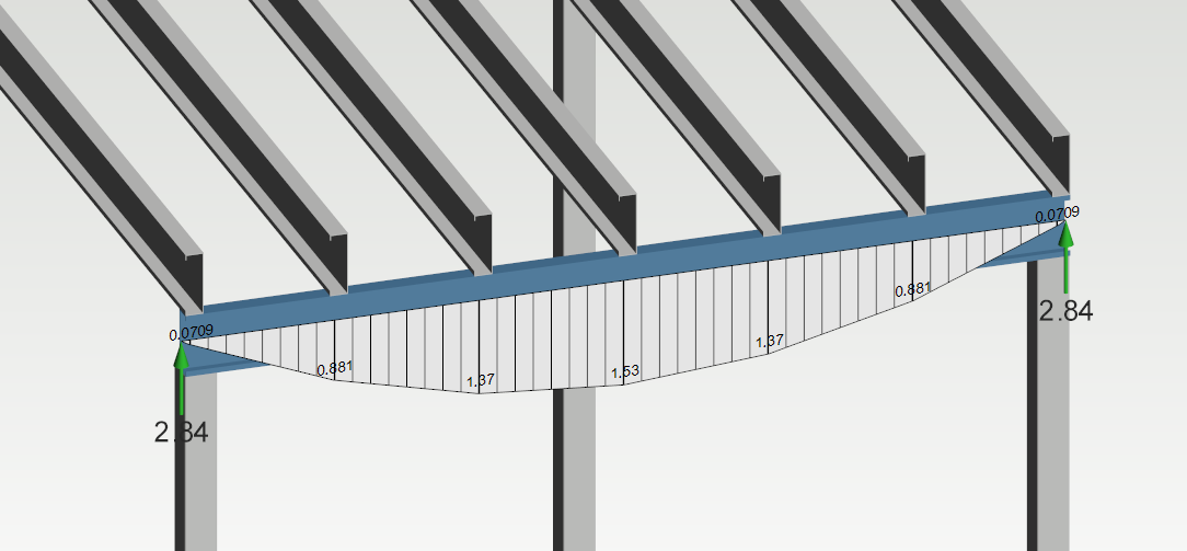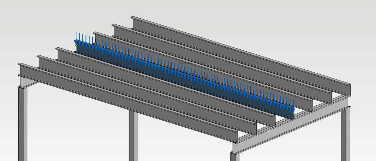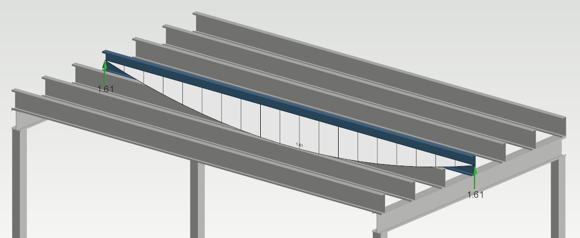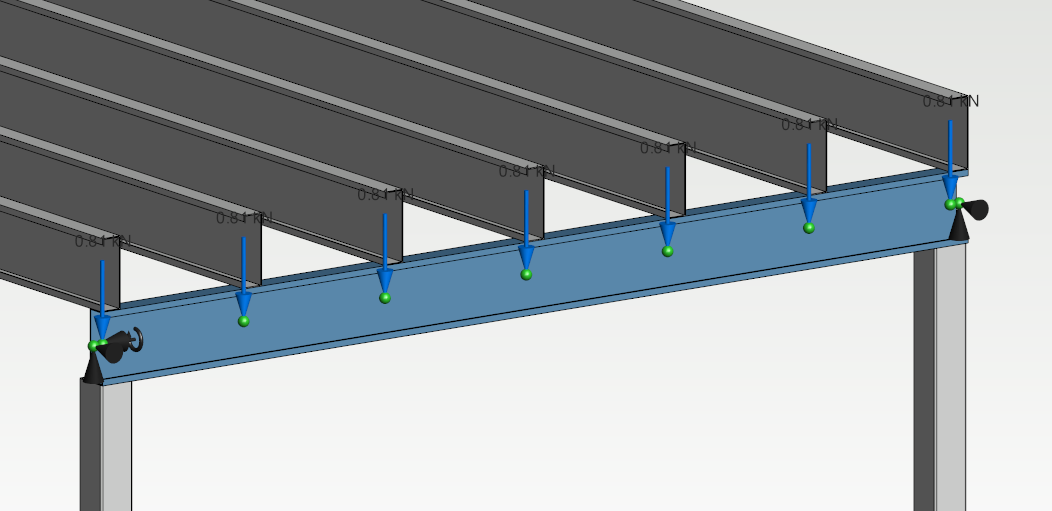 A FEA study is used to define support reactions of the beam in the structure.The floor is designed for 2.0 kN/m2 load. This is simplified example so load is not divided for live and dead loads. Beam spacing is 400 mm when a line load for each beam is 2.0 kN/m2 * 0,4 m = 0,8 kN/m. There is only one beam member in this study and it is loaded with 0.8 kN/m line load.