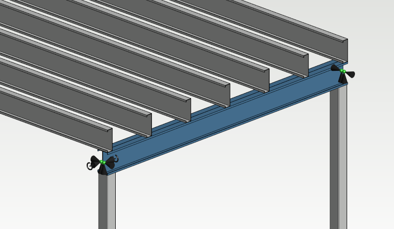 Capacity of the doubled beams cannot be checked correctly against transverse loads if node links have been used between floor joist and beams, although the FEA model is solved correctly. The correct way to model doubled beams is to check the support reactions of the floor joist and add equivalent loads to the doubled beams. If there are two identical beams against each other, support reaction loads needs to be divided equally for both beams.