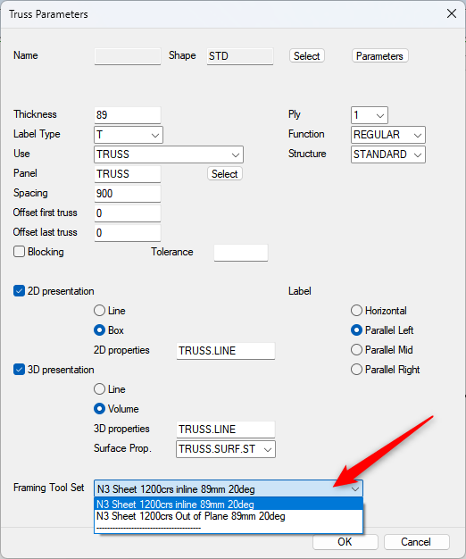 When adding trusses, the truss framing tool sets are set in the truss parameters.