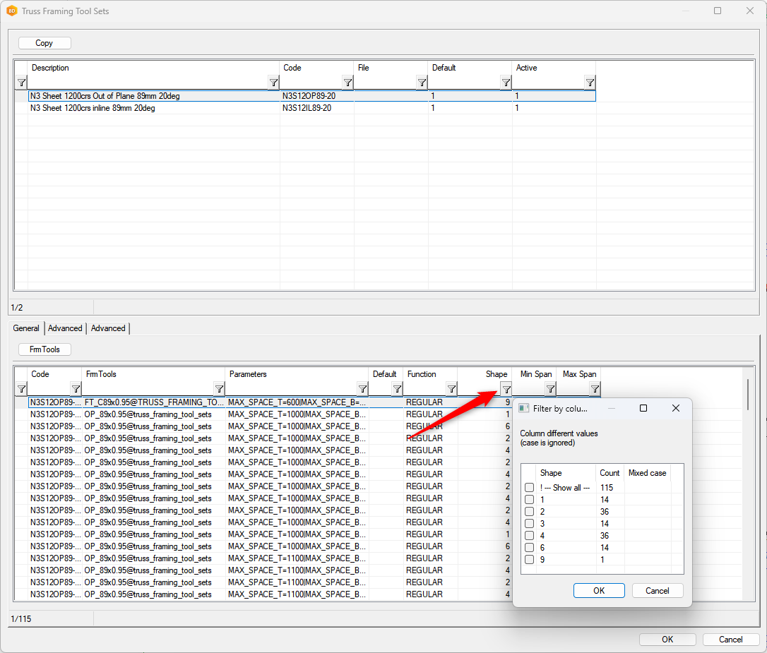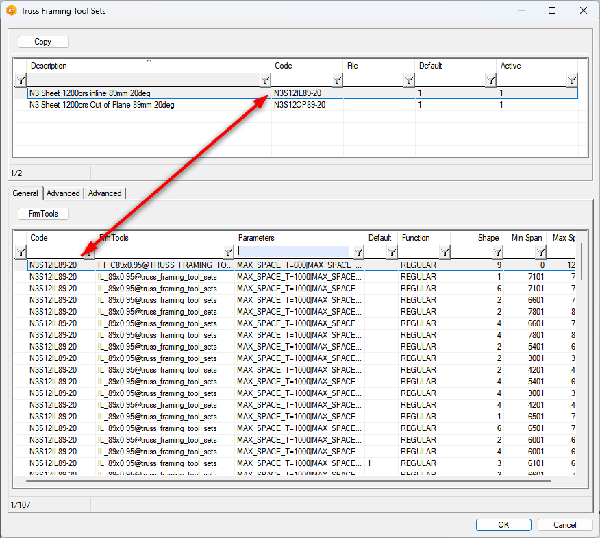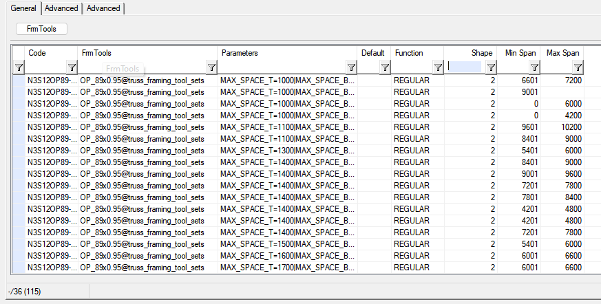 All columns from Function on, including all those in the 2 Advanced tabs, contain specific filter information. When parts are generated for a truss, the truss parameters, such as shape, span, pitch and thickness, etc., are used to determine which truss template and framing tools (Parameters column) are used to generate the truss. The first row found to comply with the truss will be used. If none is found, the default row is used.