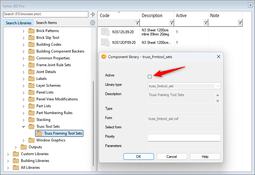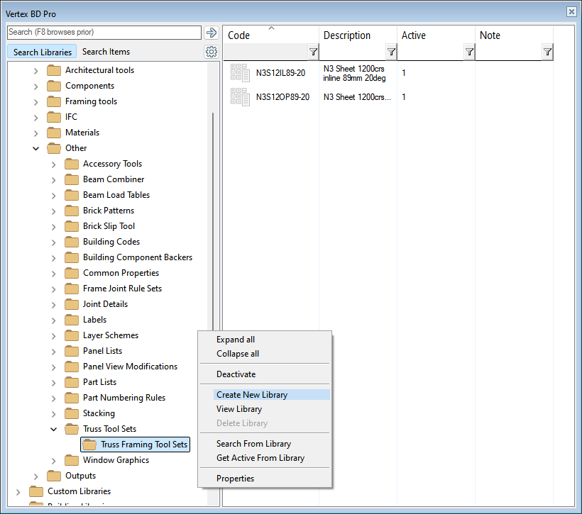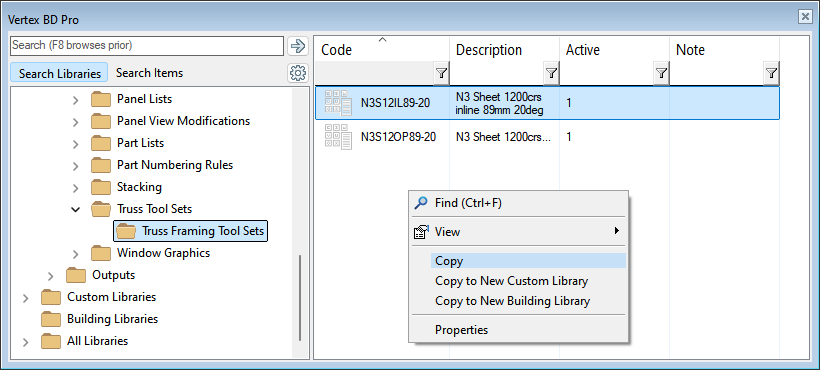 4. At this point you will see the framing tool sets available from the custom library and the system library. They may look like duplicates. To turn off framing tool sets in the system library so they do not show, right-click the Truss Framing Tool Sets system library, go to properties and untick Active.