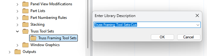 Firstly, to edit any data, it must be done in the custom library. If the Truss Framing Tool Sets is not in the custom library already, follow these steps.