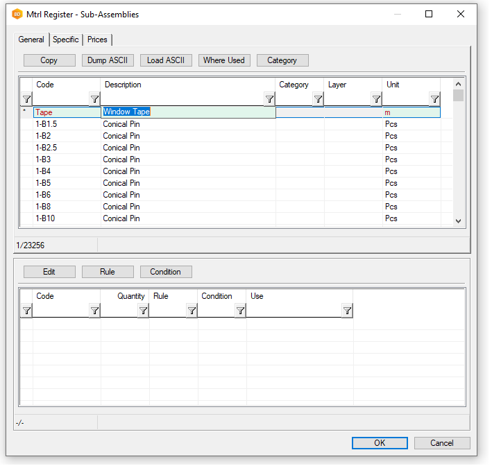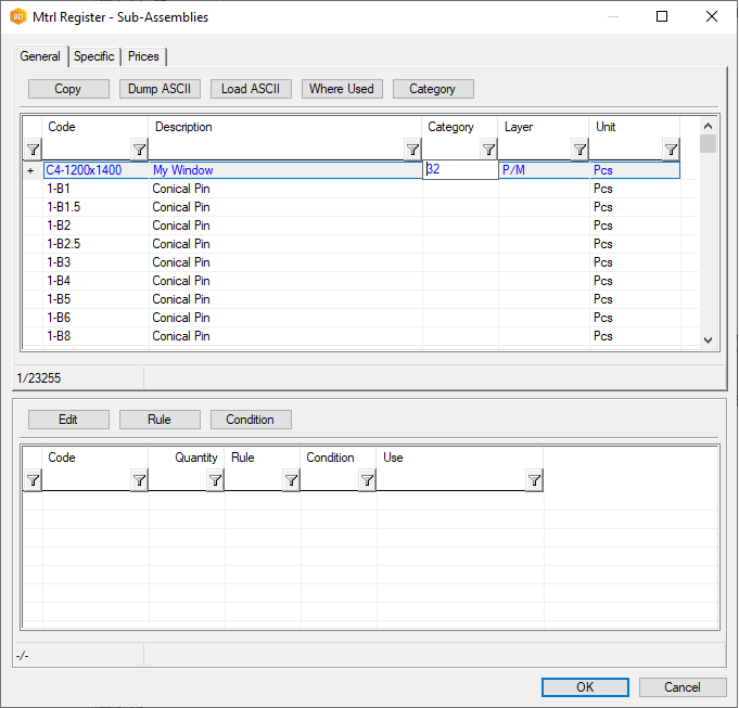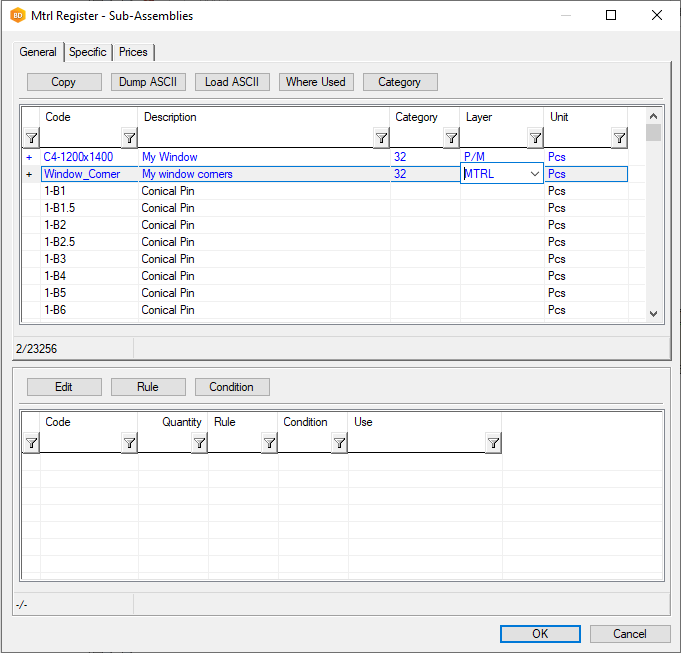 In the new blue row put in the Code, Description, Category, Layer and Unit for the window.