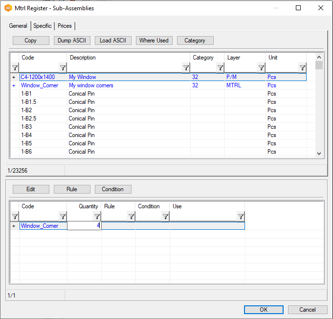 Select the C4-1200x1200 component and in the bottom window right-click to add a new row. Add here the Window_Corner with a quantity of 4.