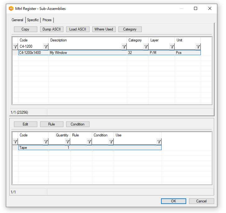 Select the C4-1200x1400 window in the register and give it the tape as a subassembly.