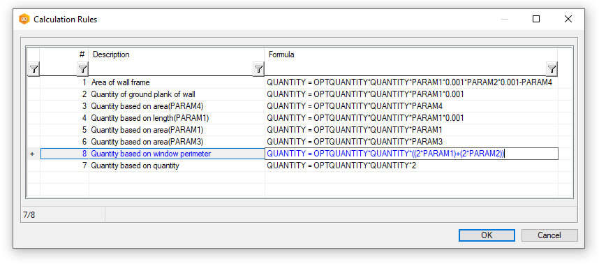 Here rule 8 is created which multiplies parameter 1 of the window by 2 + parameter2 of the window by 2 multiplied by the quantity of the subassembly.
